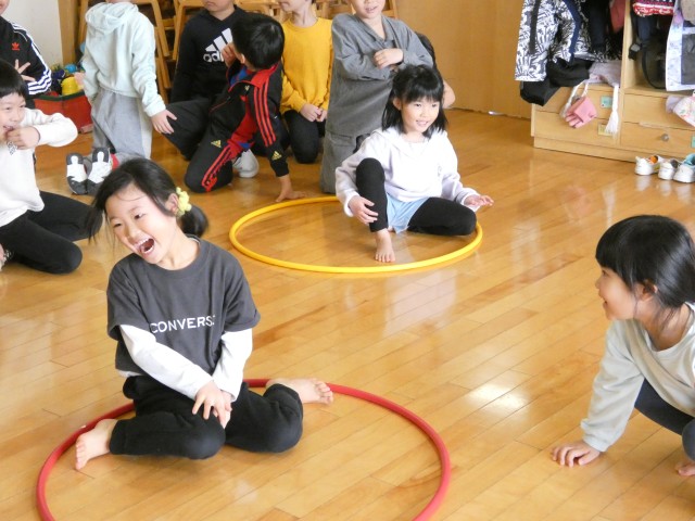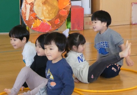 すみれさんはお部屋で制作をしていましたが、その後ホールでフープを使ってイス取りゲームのように曲が止まったらフープに入るというゲームをしました。先生が「赤と黄色」などとフープの色を指定するので、その色のフープに入りますよ。あれれ、違う色に入ってすまし顔のお友だちもいましたよ。