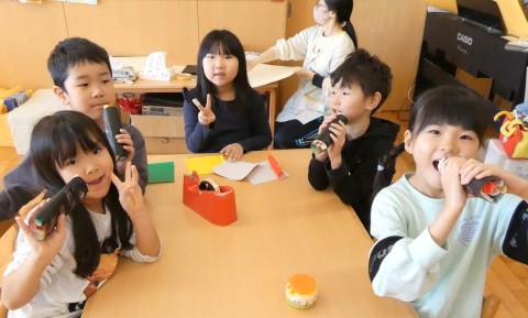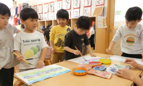 さくらさんの2月の制作は氷の小山にペンギンです。氷の表現は白いクレヨンで雪の結晶を描いて、その上に薄い水色などの絵の具を塗ってはじき絵で制作していました。とってもきれいにできていましたよ。ちゅうりっぷさんでは恵方巻を作っていました。折り紙を丸めて、キュウリや卵などを表現していて、すぐに恵方巻だとわかりました。「みんな、食べた?」と聞いてみたら「食べた!」と元気に教えてくれました。こんな立体的な制作もおもしろいですね。