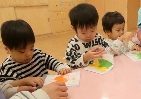 つくしさんのお部屋では、ビニール袋の風船を追いかけて遊んでいました。そして数名ずつ呼ばれて、制作をしていましたよ。制作はジップロックに好きな絵の具を入れて閉じてから、指で模様を描いていくと、個性的な作品になっていきましたよ。色んな表現の方法があるんですね~。
