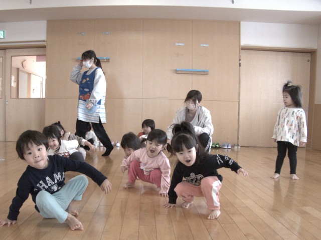 今日は、つくしさんがホールで遊んでいました。一遊びした後、みんなでアヒルさんになってみましたよ。こんなこともあんなこともできるようになっていって、遊びながら丈夫な足腰になっていきましょう。