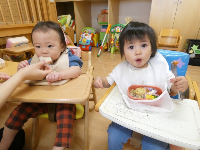 すみれさん以上のお友だちは、ホールに敷物を敷いて、ピクニックごっこで頂きました。敷物を敷いて座ると、姿勢が悪くなったり、上手にお口に運べなかったりしますが、それも練習ですね。