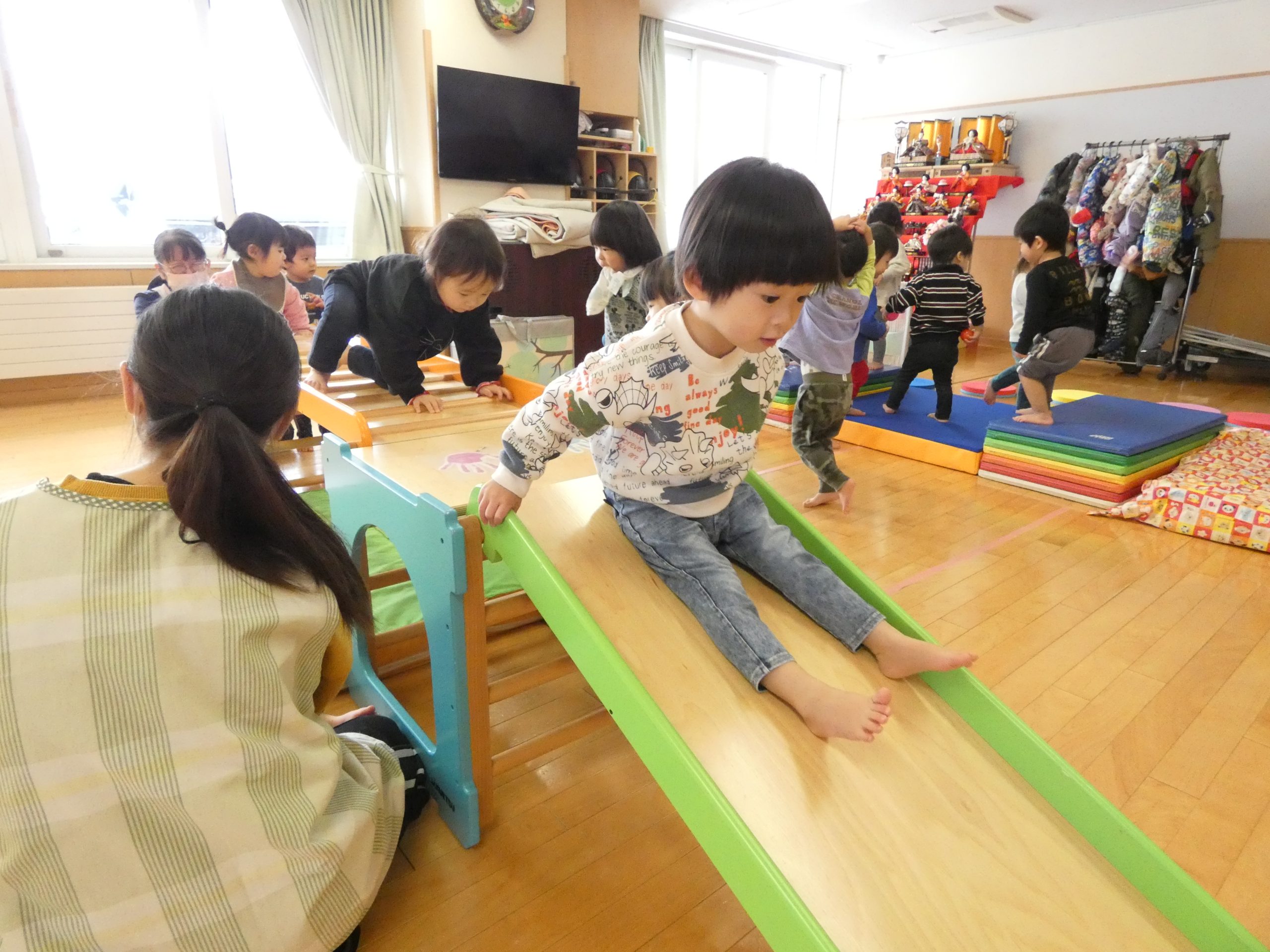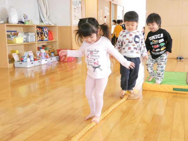ホールではたんぽぽさんがサーキットで遊んでいました。フープを両足飛びで進み、マットで転がり、跳び箱の小山を超えて、綱渡りをしていました。綱の上を歩くのは大人でも難しいのですが、上手なお友だちは足の指でしっかりと綱をつかんで進んでいて驚きました。