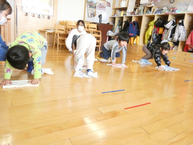 さくらさんは雑巾がけをしているのかと思ったら、グループ対抗の競争でした。足の下にも雑巾があって、手を伸ばして足を引き寄せて前に進みます。手と足の連携がなかなか難しくて、大変そうでした。でも、遊びながら色々な力が付くなぁと思って見ていました。