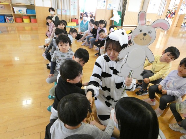 ウッシーが「うしのおはなし」という紙芝居で、牛についていろいろな事を教えてくれました。「みんなのおっぱいは、いくつありますか」「二つ!」。「では、イルカは?ウサギは?ブタは?牛は?」気にしたことがなかったので大人も首をひねっていました。正解は、イルカは2つ、ウサギは4つ、ブタが14個、そして牛は4つです。一年に育てられる赤ちゃんの数がおっぱいの数だそうですよ。それから、牛のお乳から作られるもののお話や、一日にどれくらいのお乳を出すのかとか、牛の重さ、大きさ、餌のお話など色々と教えていただきました。