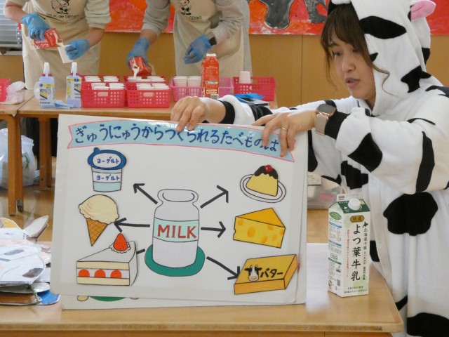 今日はすみれさんがミルクキッズチャレンジをしました。これまで、さくらさんがジンギスカンセミナー、ちゅうりっぷさんがホタテセミナーと行ってきましたが、すみれさんはいつも指をくわえて遠くから見ているばかりでしたね。今日は、すみれさんが牛さんについて色々と教えてもらって、ミルク蒸しパンと牛乳を頂きました。