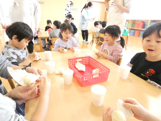 みんな静かにしっかりと聞いていたので、ウッシーもびっくりしていましたよ。お話を聞いている間に、蒸しパンができ上ったようです。手洗いをしてからみんなで頂きました。ほんのりミルクの甘い風味がするしっとりとした蒸しパンでした。「おいしい!」と笑顔になっていました。