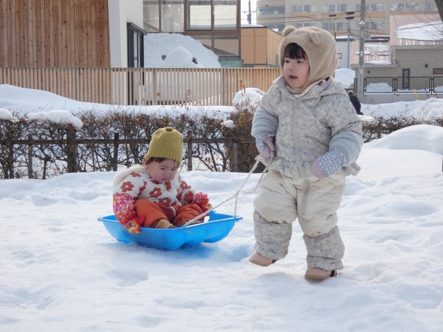 つくしさんは園庭でお友だちが乗ったそりを引っ張ったり、小山から滑ったりして遊びました。それにしても力持ちですね。あちこちでお友だちの乗ったそりを引っ張っている姿がありましたよ。