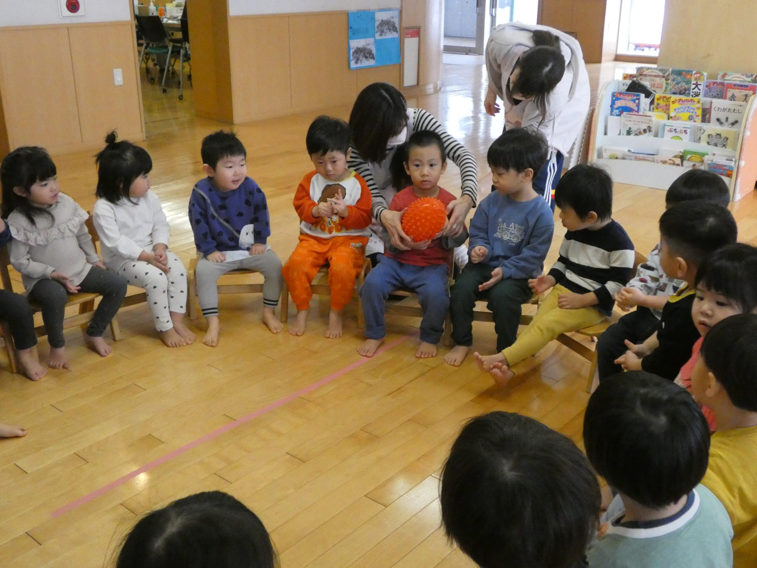 お部屋でお絵かきをしていたたんぽぽさんが一時保育室に出てきて、爆弾ゲームを始めました。爆弾に見立てたボールを曲がかかっている間は隣のお友だちに渡していき、曲が終わった時にボールを持っていた人が負けというゲームです。ルールがよくわかっていないような感じではありましたが、それでもボールが来たらお隣りへという感じで楽しんで行っていましたよ。