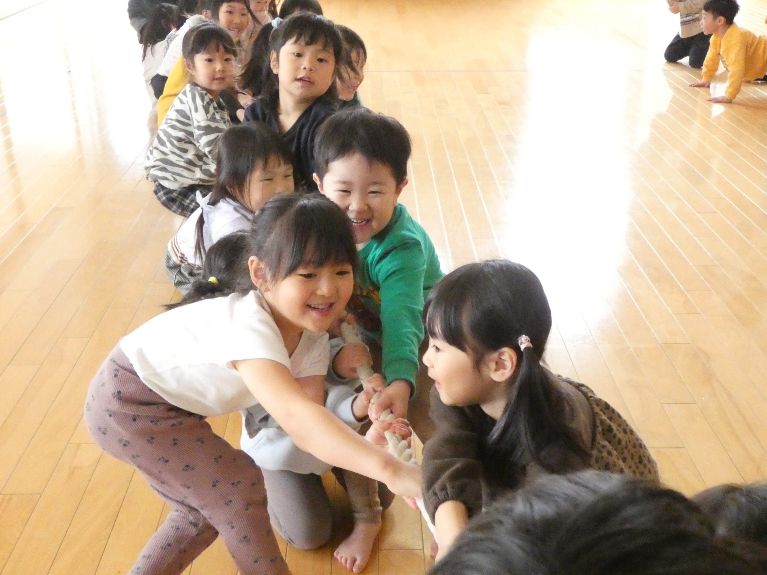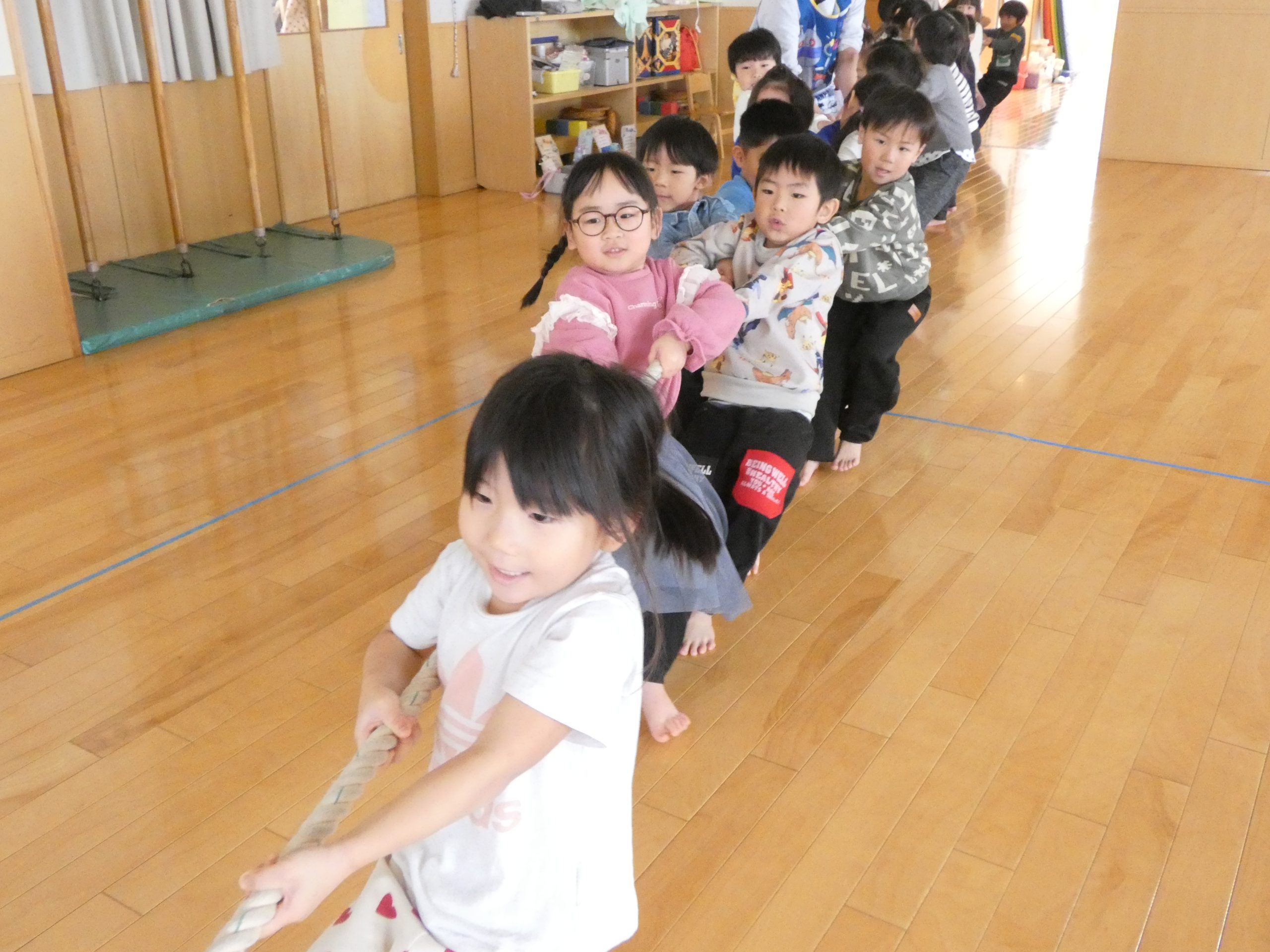 ちゅうりっぷさん(23名)対さくらさん(23名)、そこにすみれさん(13人)が半分ずつ加わっての綱引きではちゅうりっぷさんが勝ちました。さすがですね。そこで、ちゅうりっぷさんの男の子に抜けてもらっての対決ではさくらさんの勝ち、女の子が抜けて男の子とすみれさんの半数の対決でもさくらさんの勝ち。とっても喜んでいたさくらさんでした。