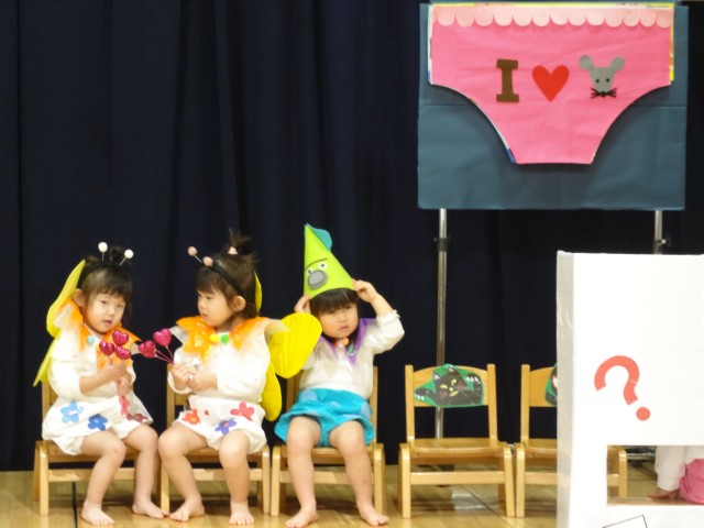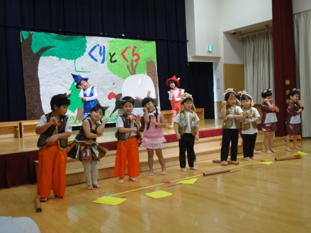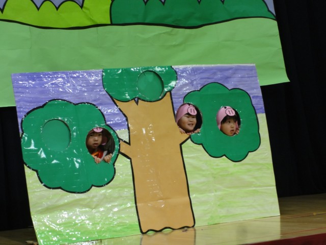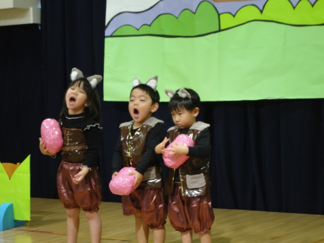 さて、いよいよ今週末が『お楽しみ会』の本番です。舞台での練習も衣装を着けたりバック幕を付けたりと、段々本格的になってきました。セリフも大きな声でしっかりといえるようになってきましたよ。お父さんお母さんに見てもらって褒めてもらいたくて、頑張って練習しているところです。