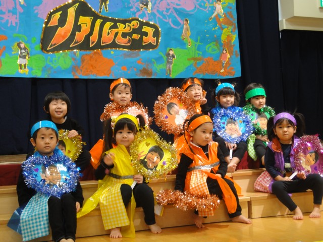 今日は『お楽しみ会』の総練習をしました。本番と同じように衣装も着けて行いました。子どもたちの中にはいつもと違うことをすることに抵抗を感じるお子さんもいるので、最初はバック幕、そして衣装というように、新しいことに少しずつ慣れていくようにしていますよ。逆に衣装を着ることで、登場人物になりきって張り切って演技するお友だちもたくさんいます。先生方は、子どもたちがちょっとでもやる気になれるようにと、衣装づくりやバック幕作りに精を出しています。大変なこともあると思いますが、子どもたちのキラキラした目を見たら疲れも吹っ飛んでしまいますよね。