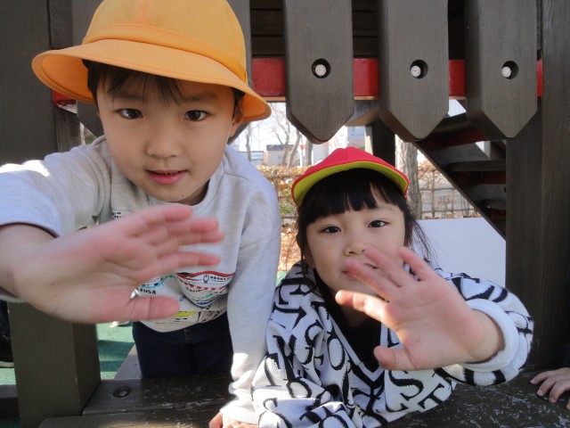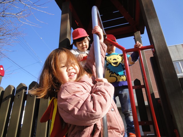 総練習も終わり、今日は青空が広がる暖かな日となりましたので、お外で遊ぶクラスが多かったです。さくらさんは園庭の登り棒の所で、上から下りる遊びに夢中でした。下りる時、最初につかまる時が一番怖いようで、慎重につかまっていましたよ。いつものお店屋さんは、今日は病院だそうなので「あの~、お熱があるみたいなんです」と言うと、おでこに手を当てて「じゃあ、薬を飲んでください」「あとはベットに寝てください」と言われました。木の葉の薬を渡され、診察終了。なりきりのお医者さんごっこ、おもしろかったです。