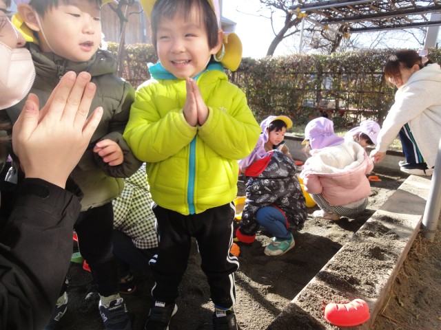 ポカポカとして気持ちの良い天気となりました。ちゅうりっぷさんはことぶき公園でおにごっこなどをしていっぱい走り回ってきました。園に戻って来て、手品を見せてくれたお友だちがいました。じ~っと見ていると、親指が離れていきました!。お友だちもびっくりです。真似しようと色々やっていましたが、できなかったようですよ。