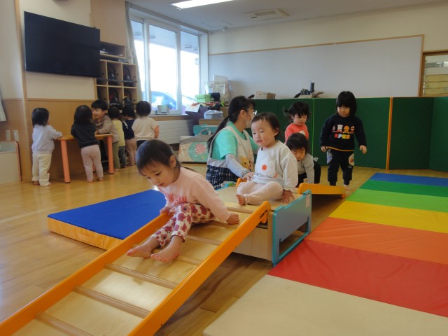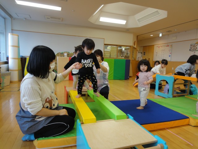 たんぽぽさんは、受け入れの時は、組み立て式の遊具を使っていることが多いのですが、平均台のような部分を渡る時、いつもは慎重に渡っているのですが、今日は両足でまたいで渡って行きました。新しい渡り方、楽しいですね。
