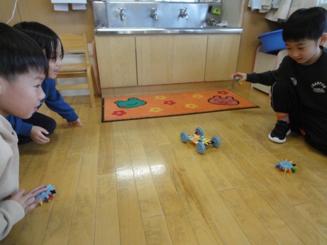 たんぽぽさんが虫の車で遊んでいました。久しぶりに見たのですが、スピードがビュンビュン出ていて、とっても早く進んでいて驚きました。つくしさんも虫の車で遊びますが、こんなに早くは進めません。こんなところでも一年の年の差を感じますね。カラーマットが並べて立てられて、その上からブルーシートをかけ、トンネルにしていました。ちょっとしたことで、ドライブがまた楽しくなったようです。