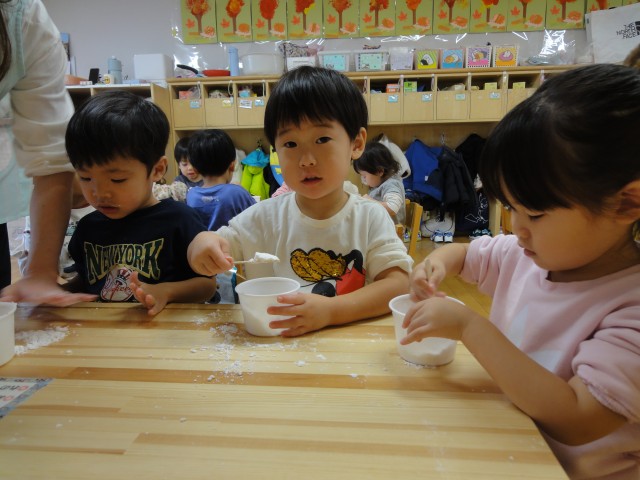 たんぽぽさんは砂遊びに夢中でした。卵焼きやウインナーの方に砂を入れて、形を作っていました。そして出来上がると、「手、パッチン。いただきます」とご挨拶をしていましたよ。
