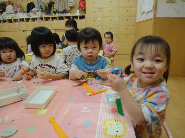 たんぽぽさんでは『片栗粉+トリートメントで粘土』という感じで混ぜたりこねたりしていましたよ。お部屋中にいい匂いが漂っていました。結局、手触りの良い粘土になって、楽しく遊びました。すべすべの感触がお気に入りだったようですよ。
