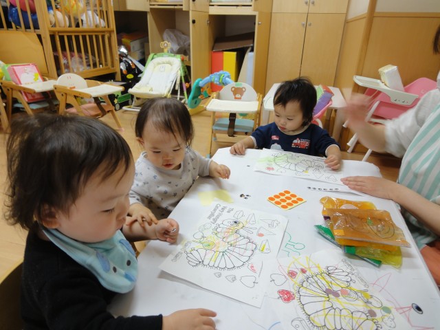 ちゅうりっぷさんも公園で思い切り走り回っていました。地面に絵を描いたり、OXゲームをしたりする姿もありました。落ち葉はすっかり色あせてしまい、残念ながらもう落ち葉遊びはできそうにありません。つぼみさんもワゴンでお散歩に行ってきました。短い秋も終わりそうですが、お天気の良い時はお外で過ごしていきたいですね。
