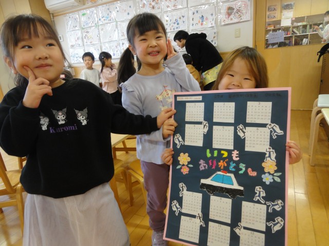 さて、勤労感謝の日は過ぎてしまったのですが、先方の希望もあり、ちゅうりっぷさんは交番へ、さくらさんは消防署へと手作りのカレンダーを持って渡しに行ってきました。消防署では色々と見せてくれたりお話を聞かせてくれたりしたそうです。「あと2週間後に新車になるので、その時にまた行ってきたいと思います」とのお話をしていました。消防士さんやお巡りさんに守られていることを知り、感謝の気持ちを持ちたいですね。見たり聞いたりすることで、より身近に感じることができたらいいですね。