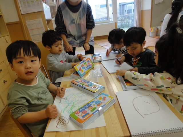 さて、クリスマス制作が各お部屋で進んでいますね。保育園の制作は、一日で終わることがありません。土台の色塗りをして、乾かして別日に続きをします。そうやって少しずつでき上っていきます。完成が楽しみですね。ちゅうりっぷさんでも、スノードームを作っていましたが、他のお友だちはどっきりするゲームで遊んでいました。いつ来るかわからないドキドキ感がたまりませんね。