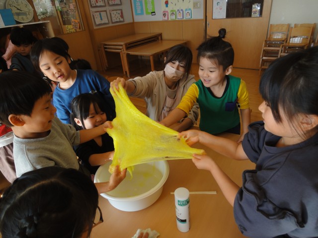 つくしさんはスライムを包丁で切って遊んでいました。いつも先生方がスライムを作るところから始めるので、筒に入って売られているとは知りませんでした。