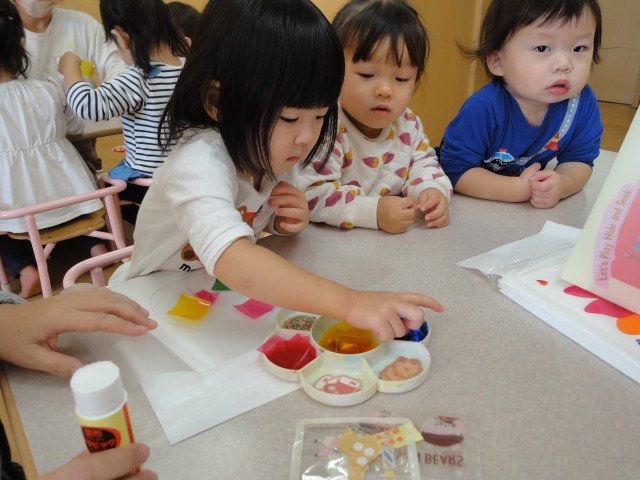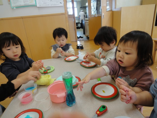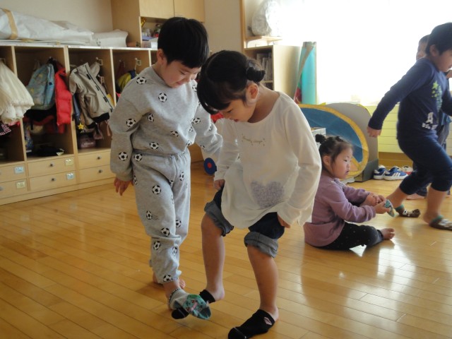 ちゅうりっぷさんはスライム作りをしていました。「まだ固いから、シェービングクリームを入れよう!」などと、固さを見ながら作っていきます。出来上がるまでの過程が楽しいですね。さくらさんは靴下取りゲームでいっぱい体を動かしていましたよ。