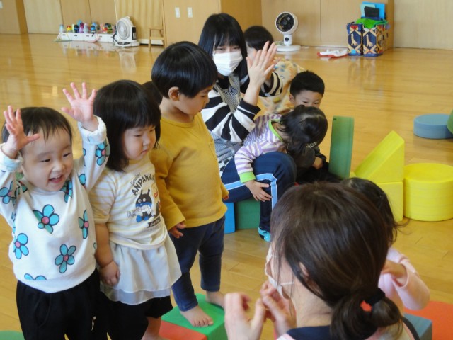つぼみさんでは先生が足の上に子どもを乗せて「バスに乗って揺られて行こう、ゴーゴー♪」と歌を歌っていました。「そろそろ右に曲がります~♪」と歌うと、ちゃんと体を倒すんですよ。こんな遊びもできるようになってきたんですね~。