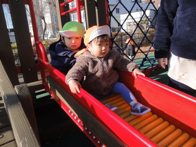 つくしさんは、ホールで組み立て式の遊具やトンネル、ソフト積み木で遊んでいました。積み木の上で、お楽しみ会で歌った歌を歌ったり踊ったりしていました。積み木の上に上がると、ちょっと高くなるのでステージに上がったような感じになるのかもしれませんね。つぼみさんは、園庭でローラー滑り台で遊んでいました。ゆっくりですが、ちゃんと自分で歩いて、滑ってくるんですよ。すごいですね~。