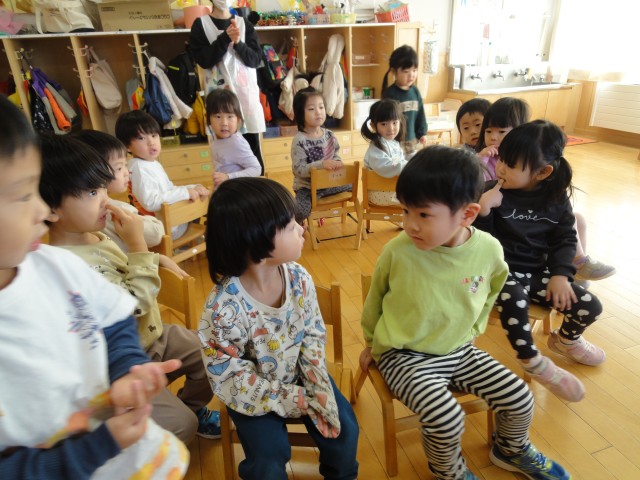 さて、ちゅうりっぷさんではお楽しみ会の後、お昼は何を食べたのか、お父さんお母さんは子どもたちにどんな風にお話していたかを聞きました。「焼き肉を食べに行った」「おすし!」「イオンでお洋服を買ってもらった」などなど、子どもたちも嬉しかったお話がいっぱい聞けました。おいでくださった皆さんもきっと楽しんでくださったことと思います。