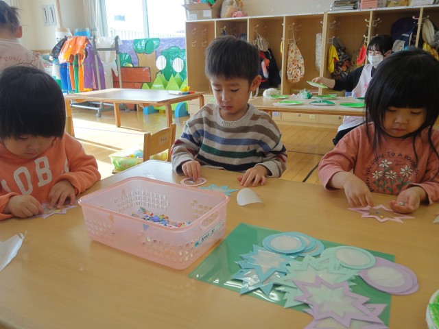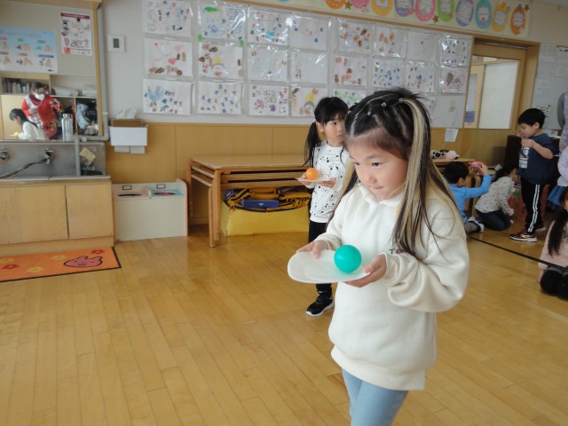ちゅうりっぷさんはクリスマス制作をしていました。小さなツリーに竹串でボンドを付けて、かわいい飾りを貼っていましたよ。こんなに細かい作業ができるんだと感心して見ていました。さくらさんは紙皿の上にボールを乗せて運ぶリレーをしていました。手始めにぬいぐるみを乗せ、両手でお皿を押さえていましたが、次は片手になり、最後はボールを乗せていました。しかも紐が貼られていてそこを潜ったり跨いだりしないと進めません。段々と難しくなっていくわけですが、上手にクリアしていましたよ。