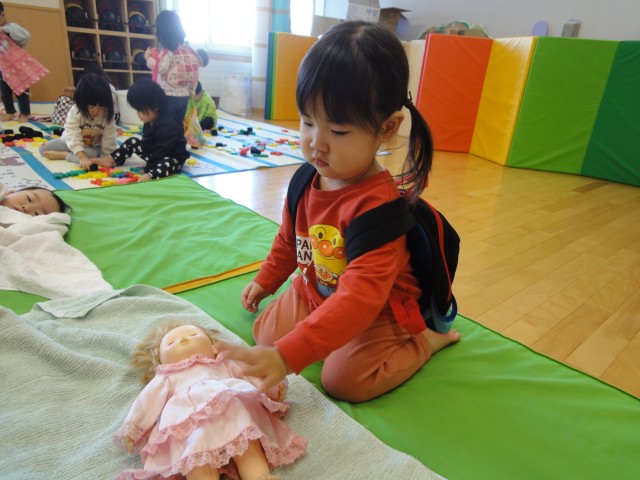 つくしさんは赤ちゃんのぬいぐるみを抱っこしたり寝かしつけたりと、お母さん役になって遊んでいましたよ。つぼみさんは、窓辺におもちゃを並べていました。こんな風に遊ぶのはつくしさんみたいです。ちゃんと成長しているんですね~。