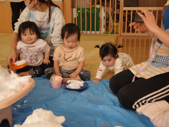 つぼみのお部屋では、お部屋に雪を運んできて、雪遊びをしていましたよ。ビニール袋に雪を入れると、綿あめにように見えました。赤ちゃんたちは袋の上から感触や冷たさを感じていましたよ。