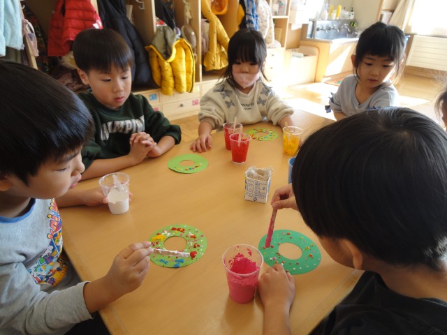 Xmas制作をしているクラスも多かったです。ちゅうりっぷさんでは、絵の具に重曹を混ぜてリースを作っていましたよ。重曹を混ぜると絵の具が立体的に固まるのだそうですよ。さくらさんは制作の第一弾として紙皿に色を塗るという作業を行ってから、園庭に出てきました。園庭にはしっかりと雪が積もり、脚絆がないと雪が靴の中に入ってくるほどでした。スノーウエアを着ているお友だちは大胆に雪を持ったりしていましたが、手袋を履かずに遊んでいるお友だちは「手が冷たい」と言っていました。急に積もってしまいましたが、もうスノーウエアや手袋・脚絆の準備はした方が良いですね。