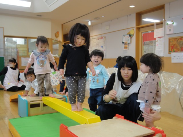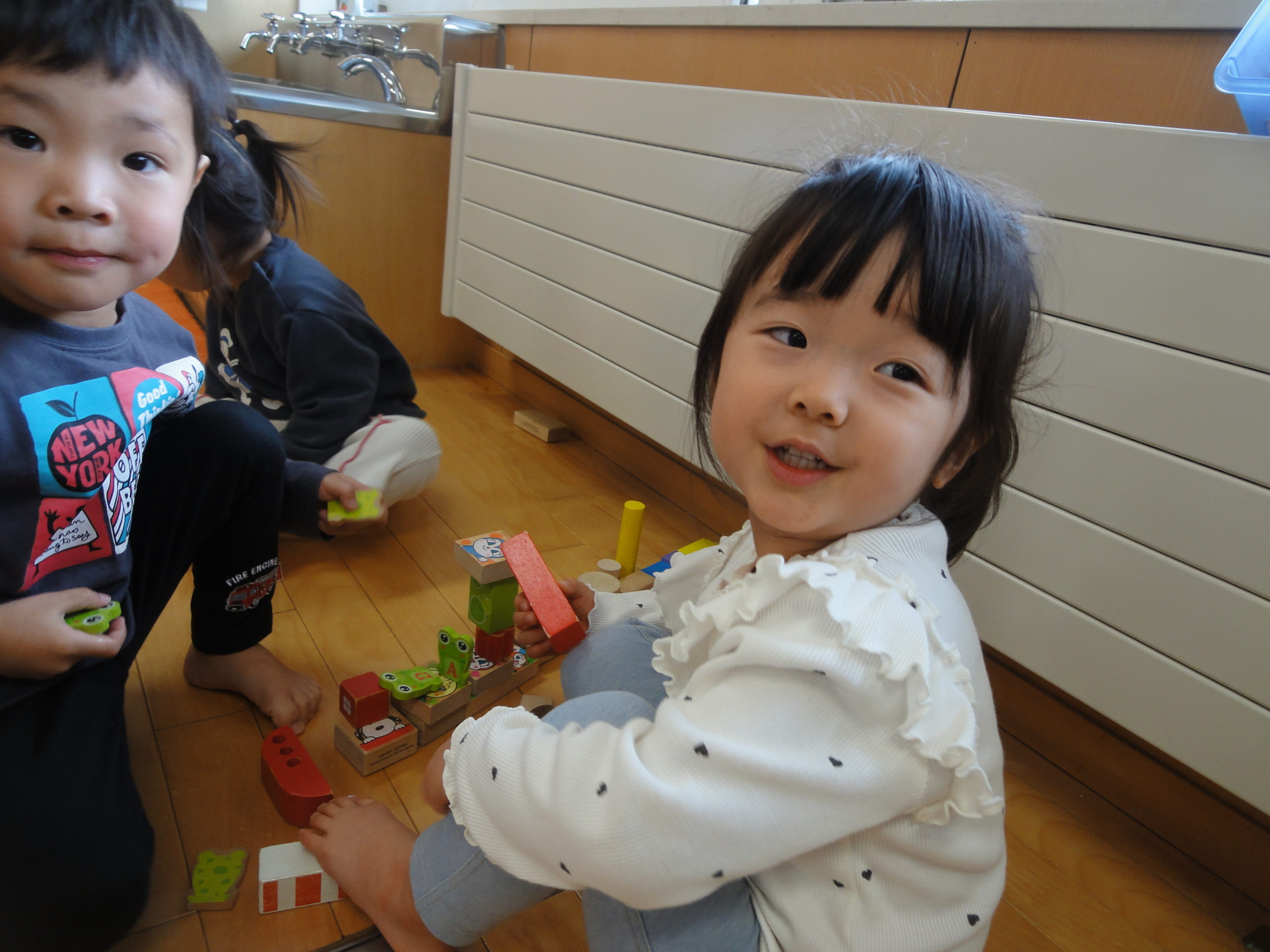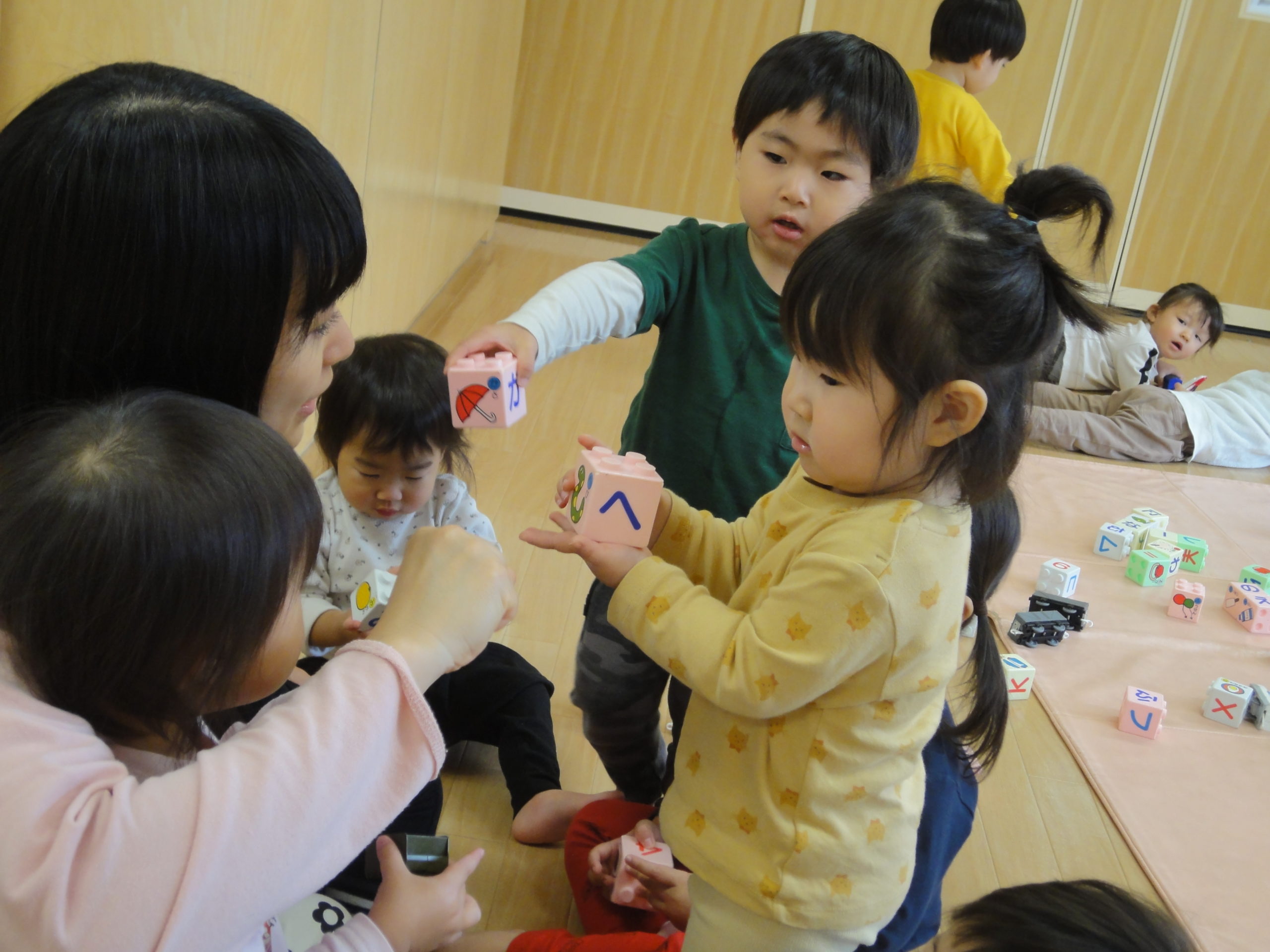 つくしさんでは、文字ブロックを積んで遊んでいました。色んな文字が書いてあるのですが、つくしさんには何と書いてあるかはわかりません。でも、先生の所に持ってきて『なんていう字?』というお顔をします。すると「『へ』って書いてあるよ」と言って、『へ』のうたを歌ってくれます。どんな文字でも歌にできる先生ってすごいなぁと感心して見ていました。