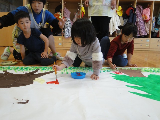 さくらさんでは、劇『ぐりとぐら』のバック幕をみんなで描いていました。絵本を見ながら、「キノコも描いた方が良いね」という話になり、最後にキノコを描き足していましたよ。子どもたちの発想で、「草はこんな感じ」という感じでササッと描いていきます。舞台を使っての練習も変わり番子に行われています。練習ありきの保育ではなく、保育の中での遊びの延長という形で楽しく練習していけたら良いなと思っています。