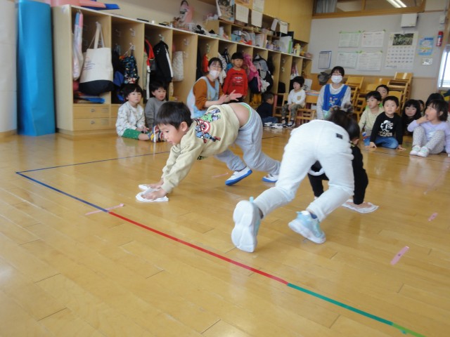 たんぽぽさんでは、さつま芋ほりをしました。ツルを引っ張っていくと、茶色の地面(ビニール袋)から紫色のお芋が出てきます。出てくるのが楽しくて、もう一度土の中に隠してツルを引っ張っているお友だちもいましたよ。すみれさんでは雑巾がけリレーの競争をしていました。雑巾がけをすることがあまりないので、どうやったらよいかわからず膝をついて進んでいるお友だちもいましたよ。雑巾がけは全身運動ですね。