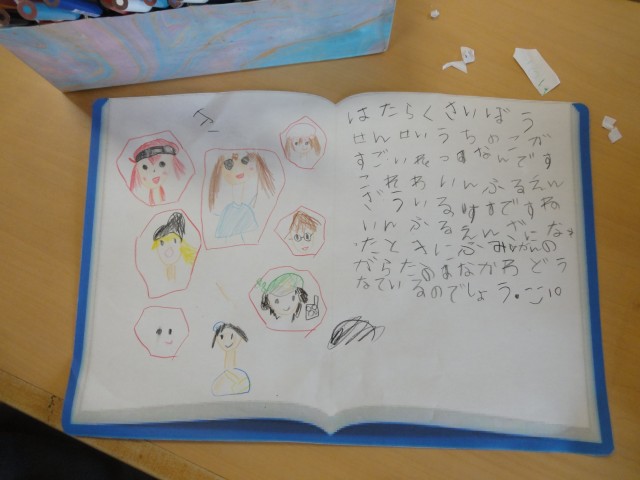 ちゅうりっぷさんは、今月の制作をしていました。本を作るイメージでお楽しみ会に行う『働く細胞』について描いていました。あるお友だちは、自分のセリフを書いていて驚きました。字も上手ですが、絵も上手で、最初見た時はシールを貼ったのかと思いました。さすがちゅうりっぷさんですね。