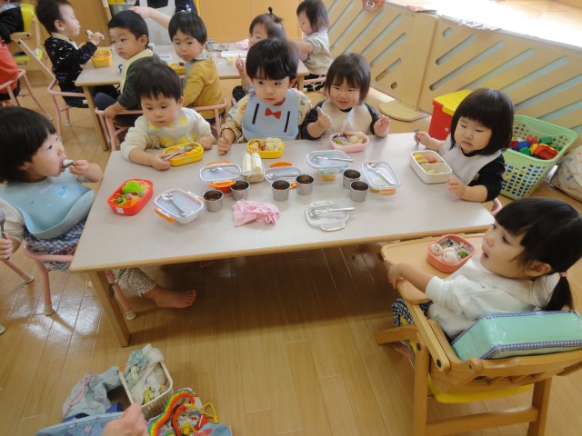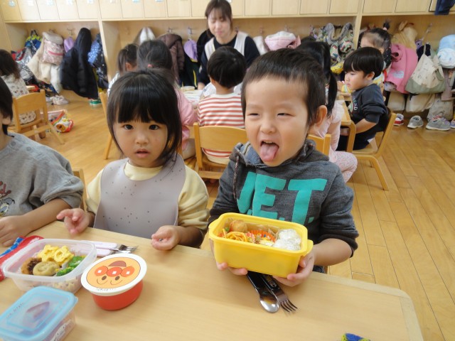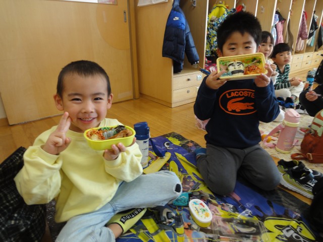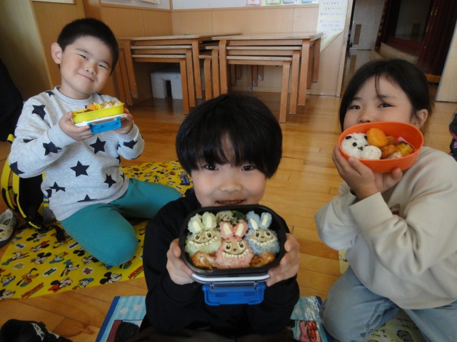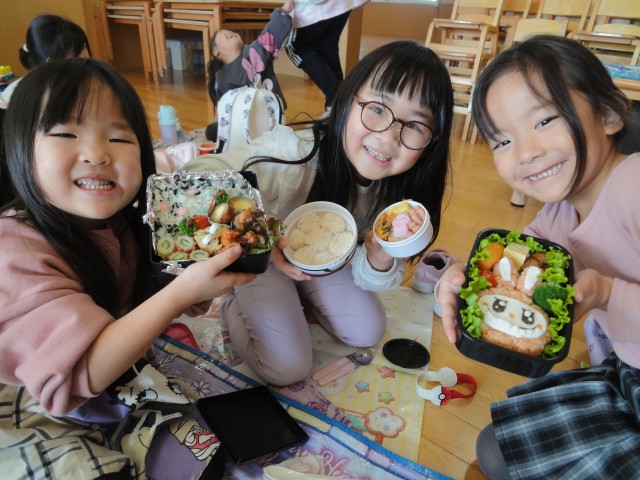 今日はお弁当の日でした。朝早くからのお弁当作り、お疲れさまでした。ありがとうございました。お弁当箱を開けると、思わず「わぁ~!」と声が出てしまいました。子どもたちもとっても嬉しそうでしたよ。