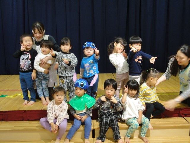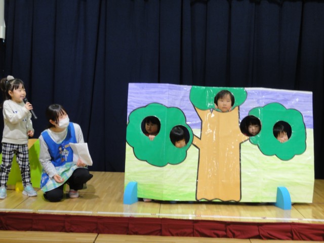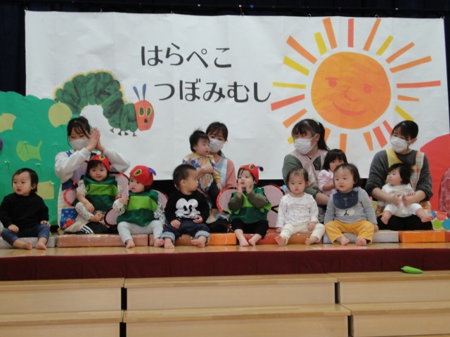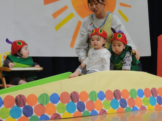 今日は0・1・2歳のお楽しみ会総練習1回目でした。ボランティアさんにもお手伝いしていただき、通して行ってみました。まず初めは、つぼみさんです。はらぺこあおむしの絵本から飛び出してきたようなかわいいあおむしたち。ハイハイで坂を上って滑り台を滑るとか、果物を木から取るとか、子どもたちができることをお見せします。最後はお名前を呼んでお返事をするところや歌に合わせて体を揺らすところをお見せして幕が閉じていきます。とってもかわいい姿に見ている方も目が細くなってきますよ。