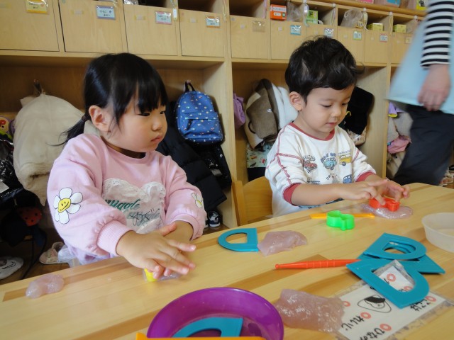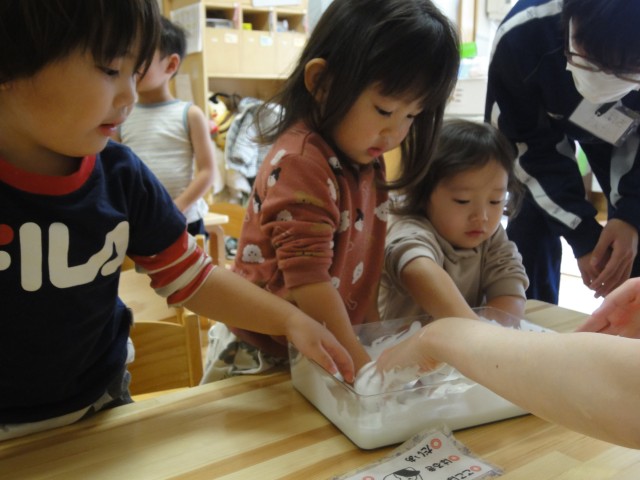 たんぽぽさんでは、先生がスライムを作ろうと一人一つずつ入れ物にスライムの元を入れてかき混ぜていたのですが、いくらかき混ぜてもなぜかスライムになりませんでした。そこで、急遽、伸びるスライムを作ろうと、インスタを見ながらその通りに材料を加えていったのですが、これまた失敗!ただのもちもちの泡になってしまいました。ちゃんと測って作っているのに失敗してしまうんですね~。先生方は「リベンジします」と笑っていました。