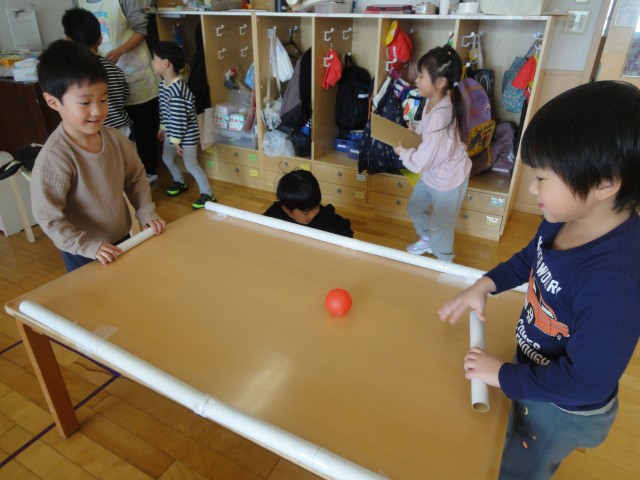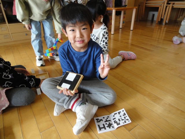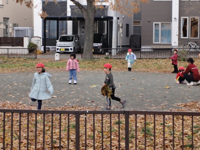 まだまだ落ち葉で遊びたいのに、雪が降ってきました。お天気が良ければお外に行けるのですが、今日はちょっと冷たい雨でしたね。でも、室内でも元気いっぱい遊んでいました。すみれさんではオセロゲームで盛り上がっていました。「おしまい!」の合図とともに、両手を上げなくてはいけません。『あそこもひっくり返したい』という誘惑に負けずにいられるでしょうか。(難しい…)