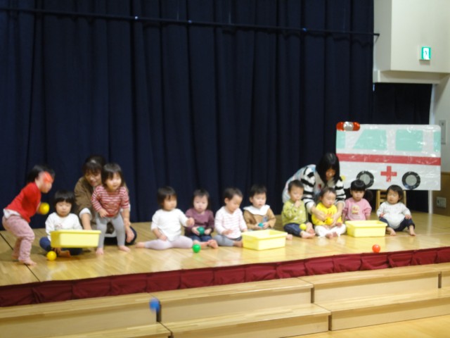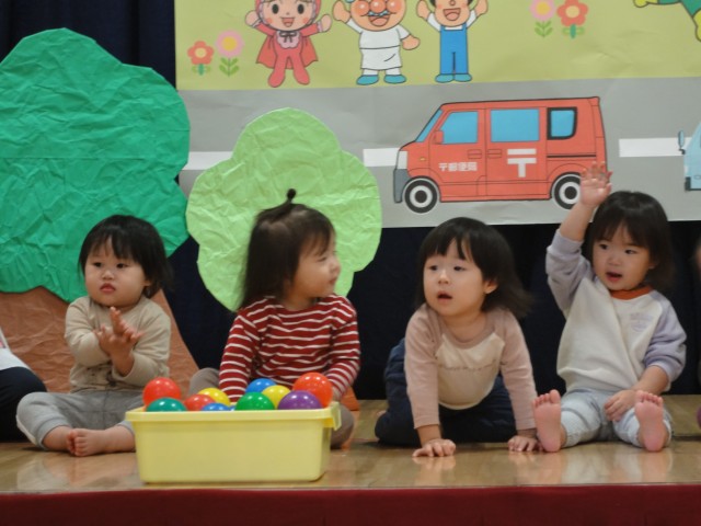 さて、舞台の上では、つぼみさん、つくしさんと順番にお楽しみ会の練習をしていました。つぼみさんは、普段の生活の中で滑り台ができるお友だちは、滑る姿をお見せし、歩けるお友だちは歩ける姿をお見せします。そんな風にできることをつなげて、物語に合わせていくわけです。そんな姿がとってもかわいいですね。つくしさんのも初めて見ましたが、客席にいるバイキンマン目がけてボールをぶつけるパフォーマンスです。楽しい企画を考えましたね~。