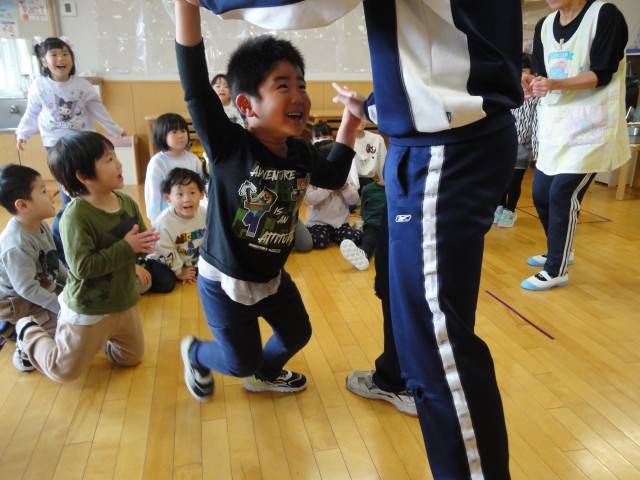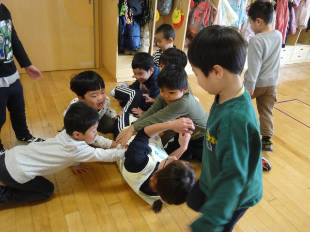 今日もでっち奉公で、北白石中学校の生徒さんたちが来てくれました。さくらさんに入ってくれた生徒さんは柔道部員だそうなので、どんなに強いか子どもたちと力比べをしてみました。まずは、お兄さんが寝っ転がって、子どもたちが力を合わせてひっくり返そうとしてみたのですが、お兄さんは全く動きません。先生も寝そべってみましたが、先生はあっという間にひっくり返されていましたよ。次に、お兄さんを壁まで押してみようと、無謀にも立ち向かっていきました。けれど、お兄さんは全く動きませんでした。柔道部で普段からいかに鍛えているかが伺えました。子どもたちにとっては岩に思えたことでしょうね。