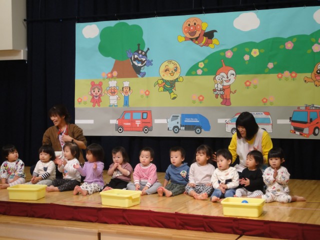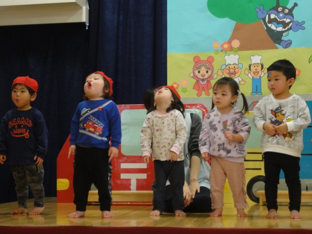 つくしさんは2グループに分かれ、アンパンマンになりきって登場し、バイキンマンをやっつけるパフォーマンをするグループと、働く車になって登場するグループがあります。どちらも歌に合わせて手遊びをする姿がとってもかわいいですよ。おやつの歌の中で「サクランボ」という時「ボ」の口をするところがあるんですが、それがとってもかわいくて思わず笑ってしまいました。