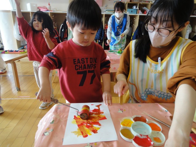 つぼみさんでは、身体測定をしていました。毎月行っていますが「大きくなったかな?」と先生が測定していましたよ。確実に成長しているので、嬉しいですね。つくしさんでは、今月の制作で落ち葉にビー玉で模様を付けているところでした。順番を待っているお友だちがうらやましそうに見ているのがかわいかったです。
