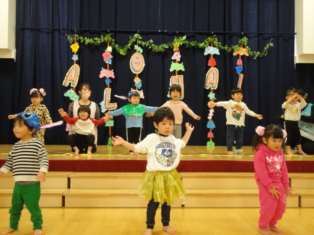 たんぽぽさんは、お遊戯チームと劇チームに分かれて行います。お遊戯は「アロハエ コモマエ」というスティッチの曲に合わせて踊りますよ。ハワイの香りが漂うようなお遊戯です。劇『シロクマのパンツ』では、動物たちが次々にやってきて、みんなでシロクマのパンツを探すというお話です。今日の練習では、バック幕を付けての練習ということで、来週はさらに衣装も付けての総練習になります。少しずつ完成形が見えてきて、とっても楽しみです。