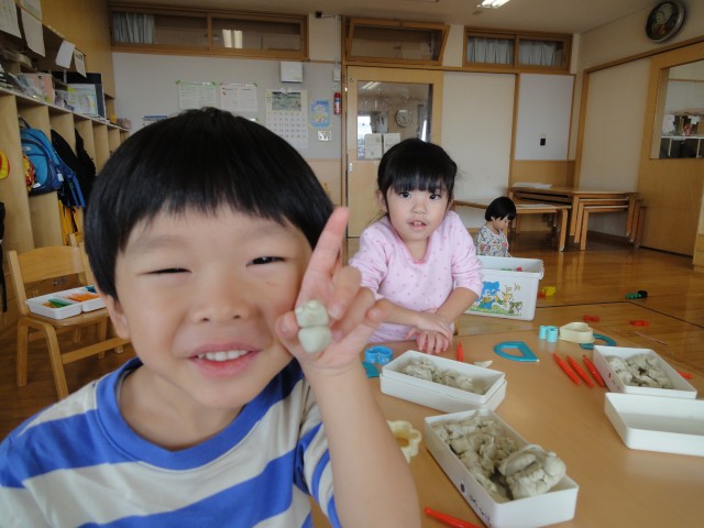 練習の合間、それぞれのクラスでは好きな遊びに夢中になっていました。ちゅうりっぷさんではパズルに首を傾けながら挑戦していました。完成するととっても嬉しそうに見せてくれました。すみれさんでは粘土遊びをしていたお友だちが、小さな雪ダルマを作って見せてくれましたよ。