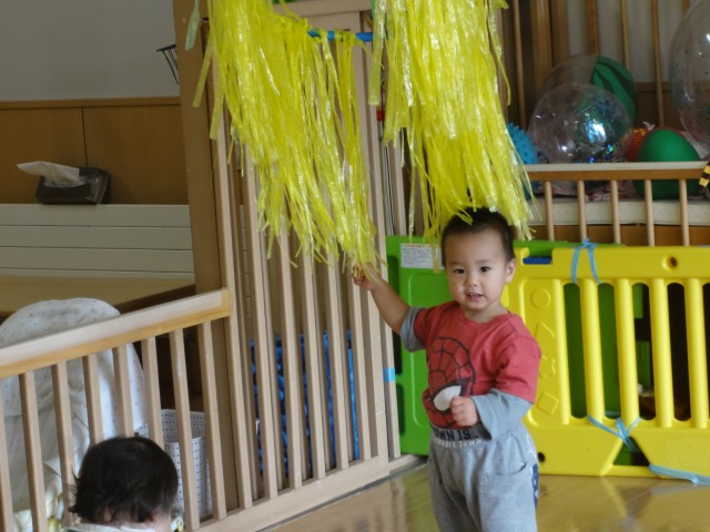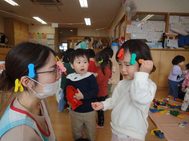 つくし組は美容室になっていました。お客さんは先生です。みんなで先生の髪を洗う真似をしたりとかす真似をしたり、髪飾りを付けたりしていました。アイクリップは普通のクリップと違って痛くないですよ。つぼみさんを覗いてみると、やっとタッチできるようになったお友だちが黄色い房に触ってニッコリしていたのを見て、スタスタ歩けるお友だちがやってきて、『僕も届くよ』と言わんばかりに触っていました。そんな様子がとってもかわいかったです。