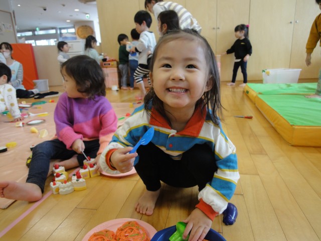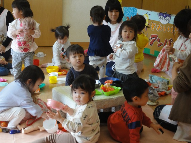 最後はたんぽぽさん。今日は地区センターに勤労感謝の日のプレゼント(カレンダー)を届けに行ってきましたよ。それからおままごとをしていました。スパゲティーナポリタンを3つもお皿に乗せて食べる真似。とってもおいしそうでした。この後「おなかいっぱい」と言って満足そうなお顔で笑っていましたよ。ごっこ遊びは楽しいですね。