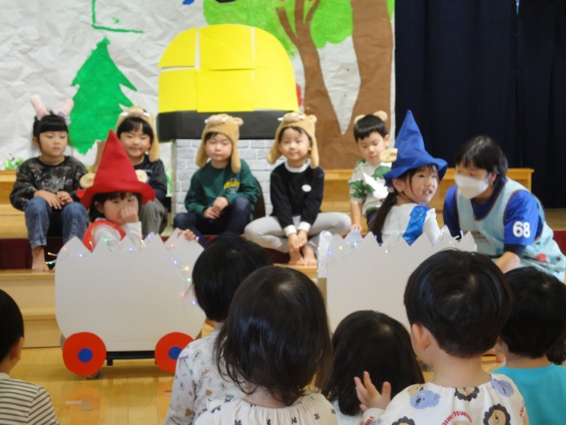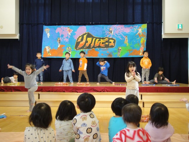 さくらさんは劇『ぐりとぐら』、お遊戯『バーニングラブ』です。ぐりとぐらでは、大きな卵を見つけカステラを作って森の仲間たちと食べた後、卵の殻で車を作った様子も再現していました。楽しそうですね。バーニングラブの衣装もかわいいですね。ノリノリですね。